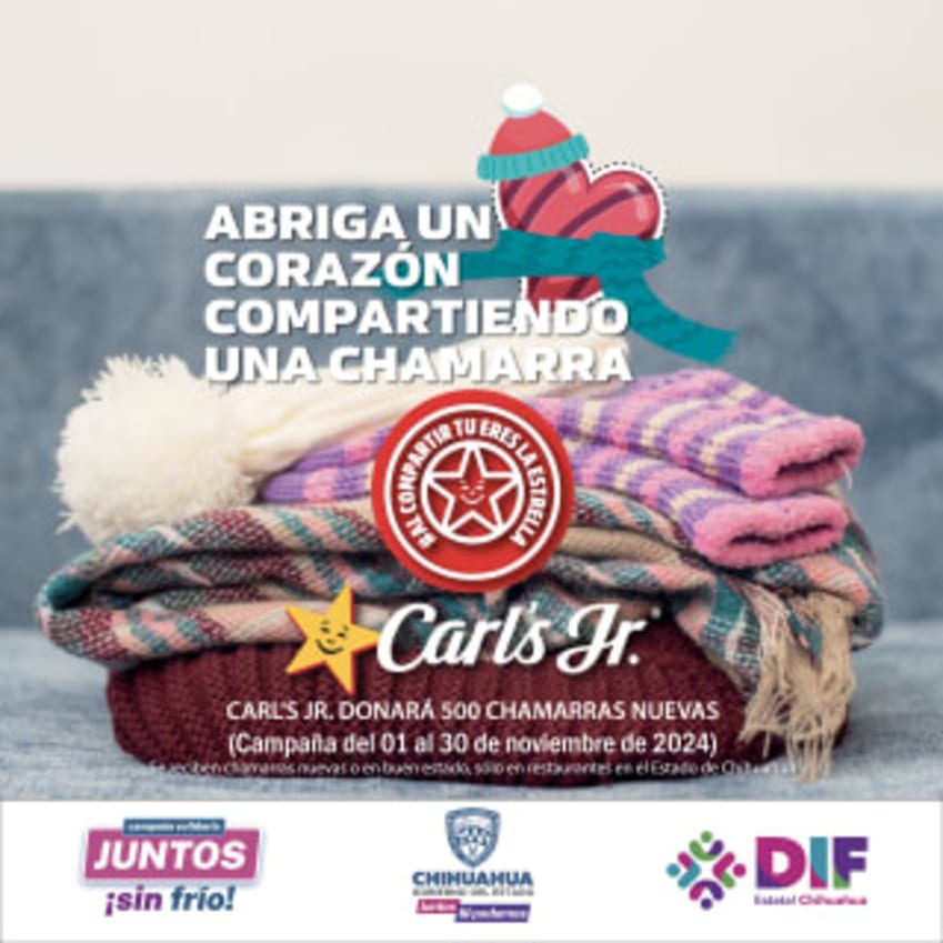 Se reciben chamarras nuevas o en buen estado, vigencia del 1 al 30 de Noviembre 2024 solo en Restaurantes Carl’s Jr. del Estado de Chihuahua. Todas las chamarras serán recolectadas y distribuidas con el apoyo de DIF Estatal a partir del 1 de Diciembre 2024.