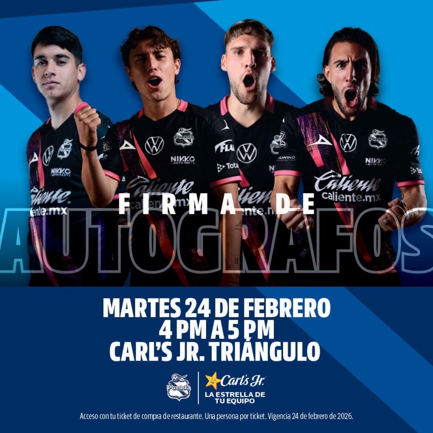 Este martes 24 de Febrero en punto de la 4:00 p.m. en Restaurante Carl´s Jr. ® “Triángulo” ven a la gran firma de autógrafos de Club Puebla contaremos con la presencia de Iker Moreno, Angelo Araos, Emiliano Gomez y Lucas Cavallini así como El Fuerte del equipo de casa, el acceso es con tu ticket de compra Carl´s Jr. ®, ¡los esperamos!